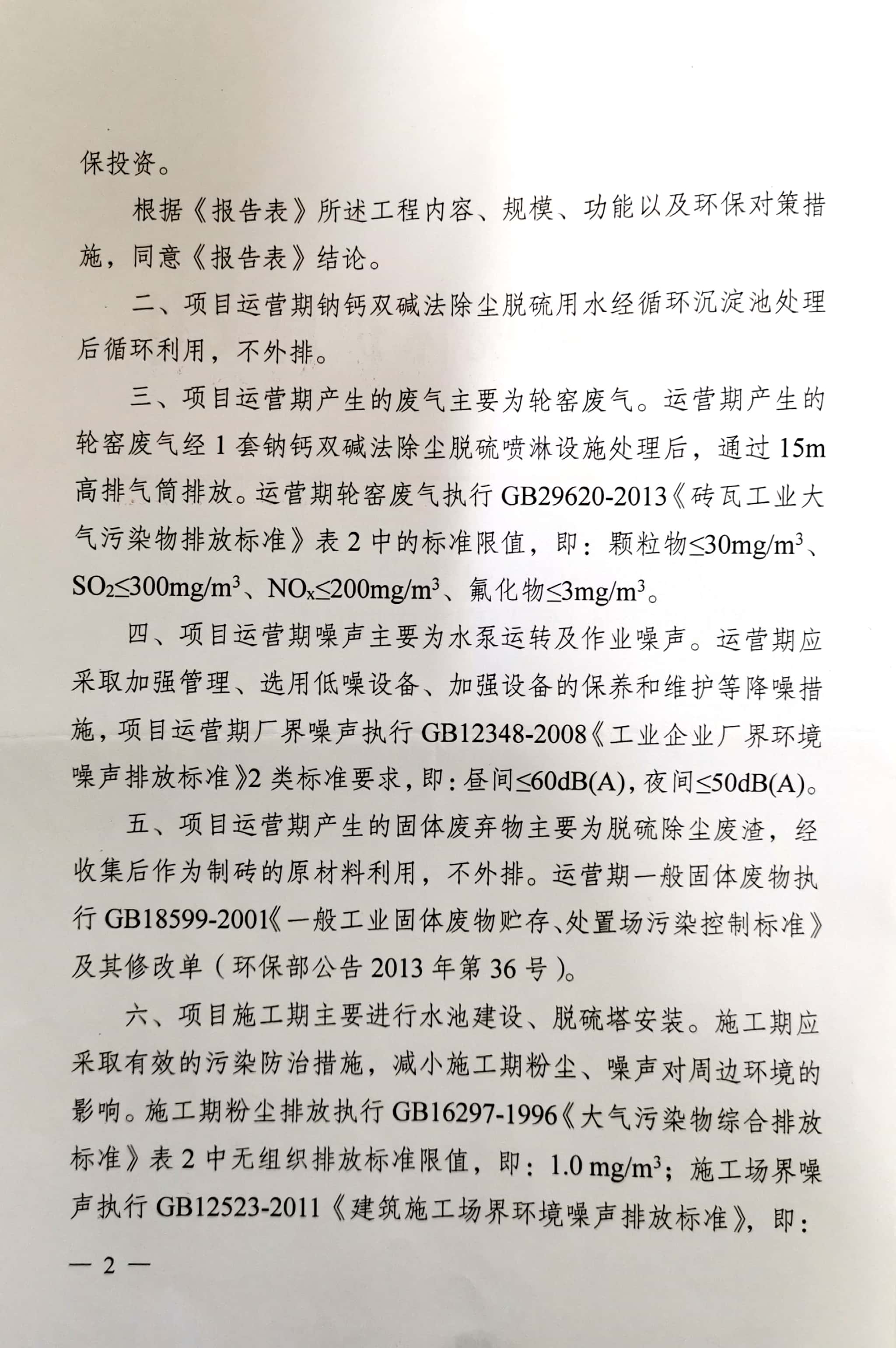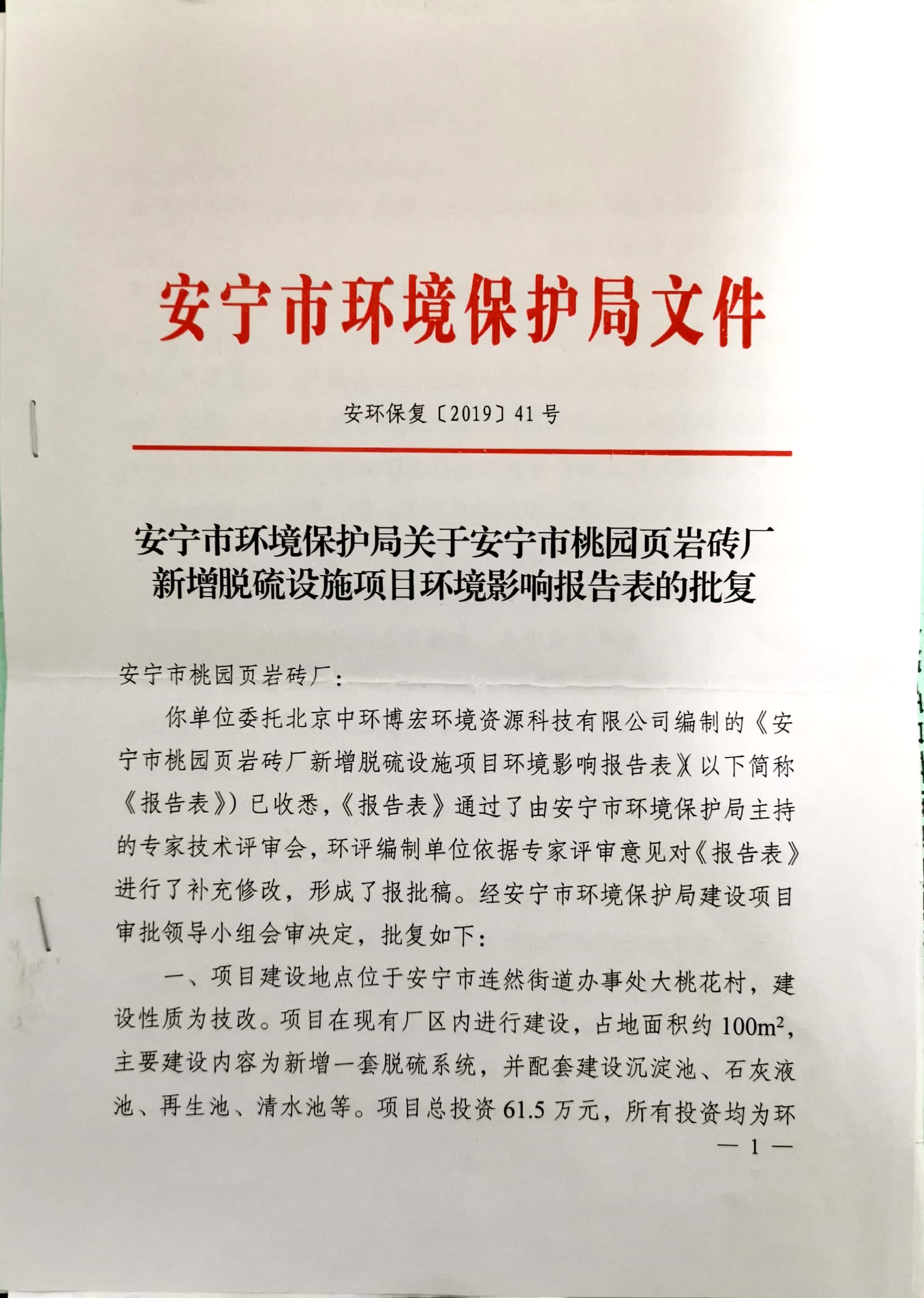 項(xiàng)目建設(shè)過(guò)程環(huán)保審批情況:2019年4月,北京中環(huán)博宏環(huán)境資源科技有限公司編制完成《安寧市桃園頁(yè)巖磚廠新增脫硫設(shè)施項(xiàng)目環(huán)境影響報(bào)告表》;2019年5月22日,該項(xiàng)目獲得安寧市環(huán)境保護(hù)局“關(guān)于《安寧市桃園頁(yè)巖磚廠新增脫硫設(shè)施項(xiàng)目環(huán)境影響報(bào)告表》的批復(fù)”安環(huán)保復(fù)【2019】41號(hào)。