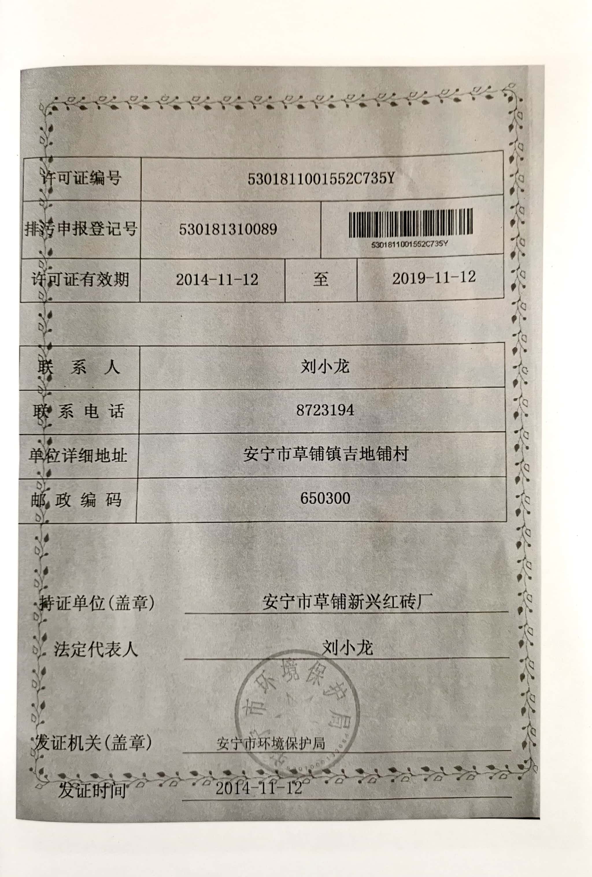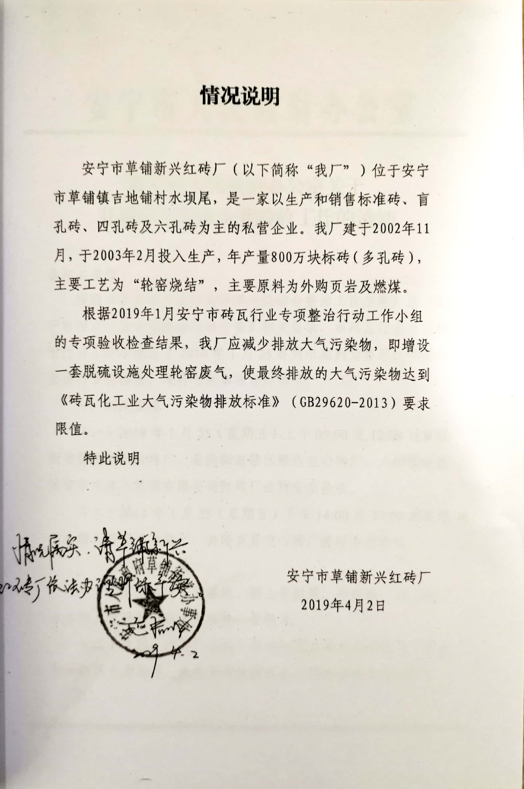 項目建設過程環保審批情況:2019年4月,北京中環博宏環境資源科技有限公司編制完成《安寧市草鋪新興紅磚廠新增脫硫設施項目環境影響報告表》;2019年5月22日,該項目獲得安寧市環境保護局“關于《安寧市草鋪新興紅磚廠新增脫硫設施項目環境影響報告表》的批復”安環保復【2019】40號。