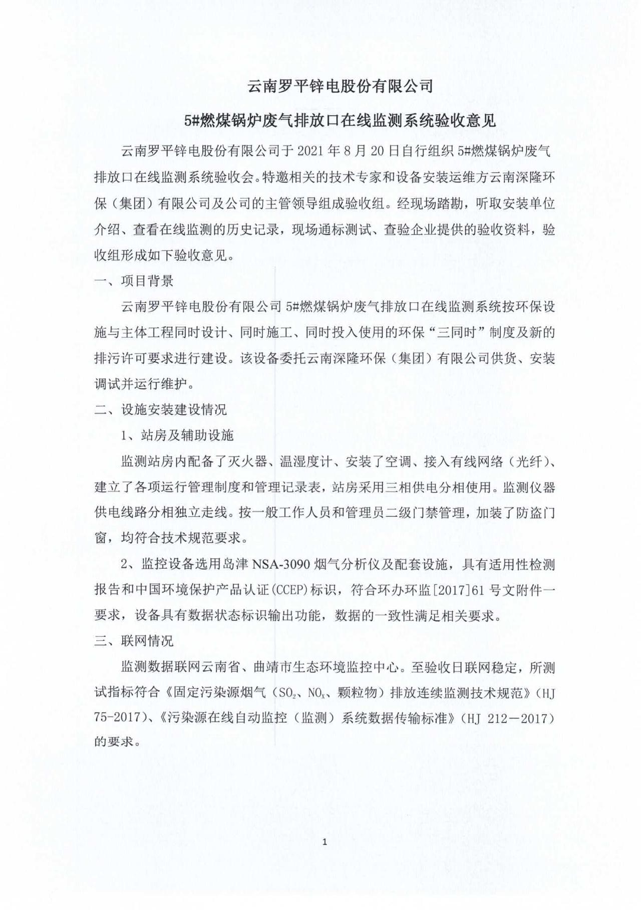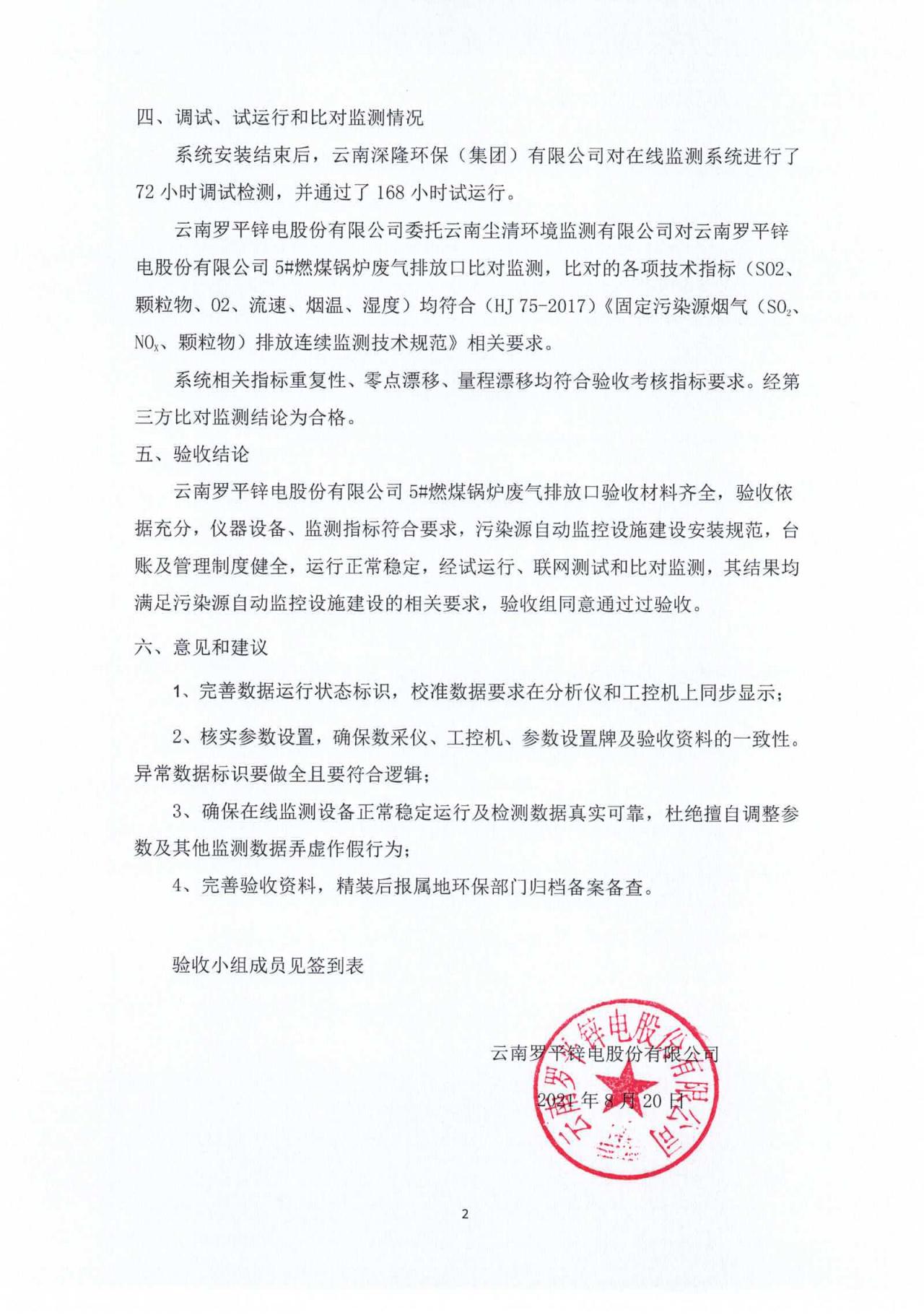 云南羅平鋅電股份有限公司5#燃煤鍋爐廢氣排放口自動監控系統驗收報�?0210820.pdf