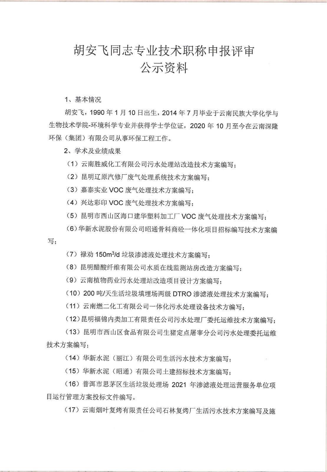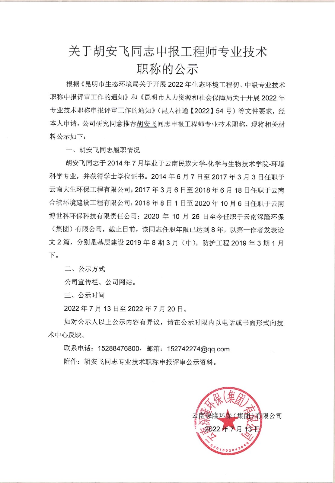關于胡安飛同志申報工程師專業技術職稱的公示(公示時間:2022年7月13日至7月20日)